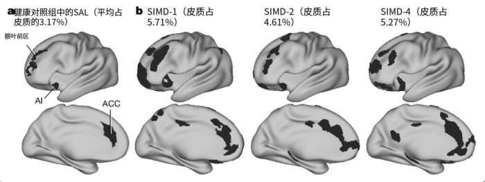 在大量样本的抑郁症患者皮层中,前纹状体显着网络扩大了近两倍:a、显著性网络(黑色)在 LPFC、ACC 和 AI 中有代表性。b、来自数据集的三个代表性个体的显著性网络丨参考资料 1