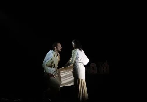 演出借助极简的道具,如黑色箱子、纱幔等表现人物关系和舞台张力。其中“纱幔”这个道具颇有深意,它不仅仅带来了延展、流动的舞台效果,更隐喻了在爱中人与人之间的关系,有的是纠缠错结,有的是难舍难分,有的是生死相隔……虽然语言文化有异,但在“爱”中,不同国家和民族都有共性,不同时空的人看待爱、追求爱也有共性。