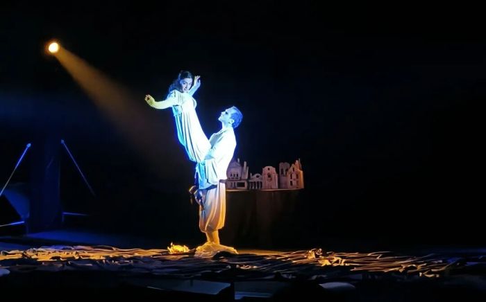 《罗密欧与朱丽叶》是莎翁最为家喻户晓的爱情悲剧。两位年轻人热烈相爱,却因家族世仇受到百般阻挠。为了追求爱情, 他们以命相争,最后双双殉情。格鲁吉亚·绍塔·鲁斯塔韦利国立戏剧电影大学的师生在经典作品的基础上,加以改编,大胆删除了悲剧中其他人物,仅以两位主角撑起整个故事,并为古典爱情注入了许多现代元素。利用木偶、城堡、床单等道具,诠释剧情走向,令人视觉一新。