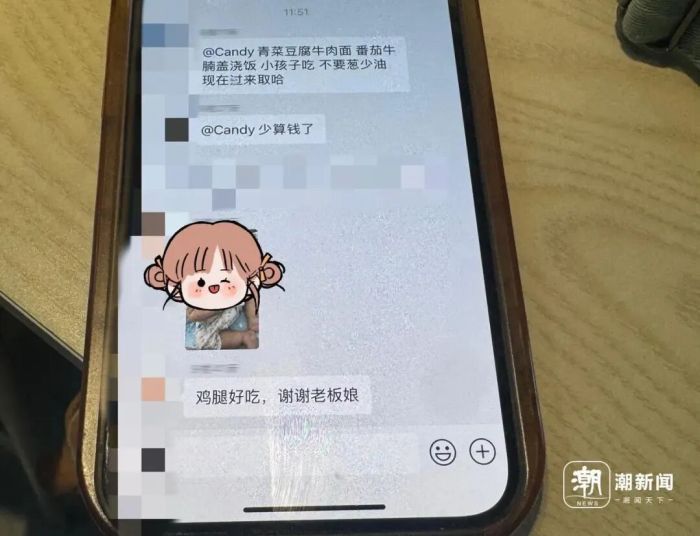 订餐群里,患儿家属给陈金雁留言。谢春晖/摄
