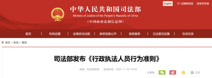 据司法部官网,11月3日,司法部发布《行政执法人员行为准则》。