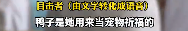 另一位目击者告诉记者:老太太的老公重病化疗,鸭子是她用来当宠物祈福的。鸭子很聪明,平时老太太有伤心事,都会跟鸭子说,鸭子已经成了老太太生活不可缺少的部分。