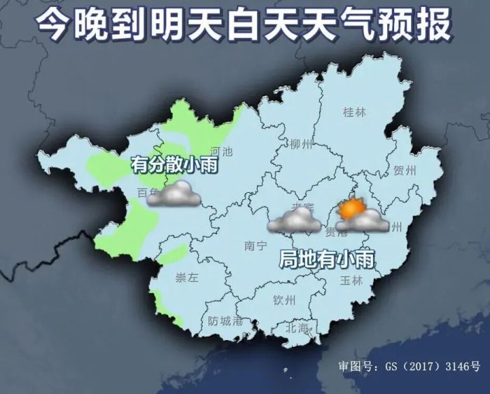 5日晚上到6日白天,百色、河池、崇左三市阴天有分散小雨,其他地区阴天到多云、局地有小雨。