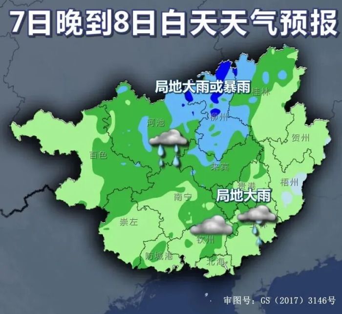 7日晚上到8日白天,桂北、桂西有中雨、局地大雨或暴雨,其他地区阴天有小雨、局地大雨。