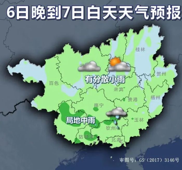 6日晚上到7日白天,桂南有小雨、局地中雨,桂北阴天到多云有分散小雨。