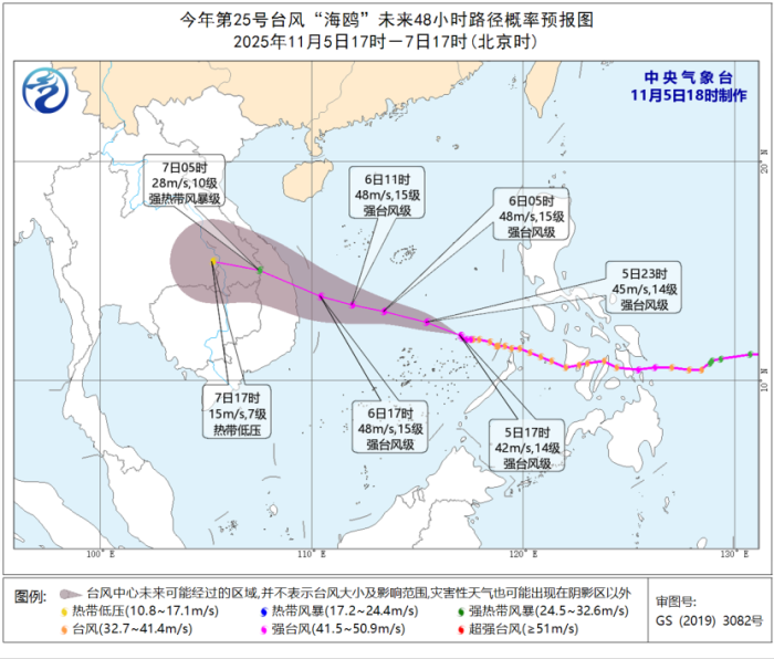 今年第25号台风“海鸥”已于今天(11月5日)下午加强为强台风级,预计将以每小时30公里左右的速度向西偏北方向移动,强度继续加强,最强可达强台风级(14—15级),并将于6日夜间在越南中部一带沿海登陆,之后强度逐渐减弱。