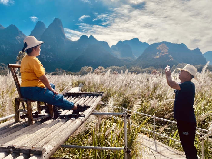 “自从这一大片芦苇花开了,每天都有不少游客专程赶来打卡。今年我们延长了芦苇栈道,栈道一直延伸到花海中央,大家在里面拍照更美了。我们还做了楼梯,让游客们可以走到芦苇里,近距离感受风起芦苇荡的快乐。”小院主理人马骏说道。据介绍,自10月国庆假期以来,小院已累计接待游客10000余人次,周末单日访客量可达300人次,成为七星区乡村休闲游的“明星景点”。除了芦苇花海,屋顶休闲区的咖啡香、镜面湖泊的倒影、围炉煮茶的惬意,让游客在赏景之余,更能感受乡村慢生活的魅力。
