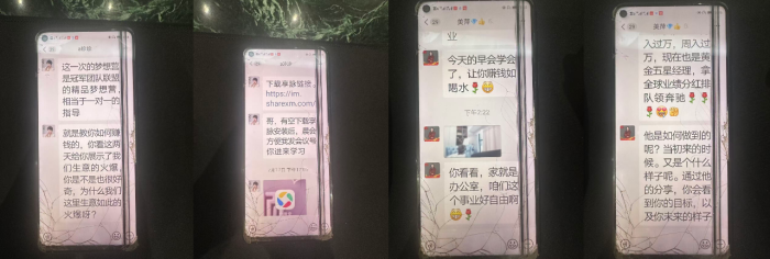 当日,曾爷爷来到营业部要求申请开立对公账户,面对工作人员关于开户用途的询问,曾爷爷的表述却让工作人员感到疑点重重。曾爷爷称已向某健康产业公司支付了1980元并成为该公司的会员,不仅能够获得等值的保健品,还获赠一万元的电子币用于在线上购买该公司产品,同时,该公司还表示,投入资金或者新招揽的成员越多,会员的等级就越高。曾爷爷了解情况后便心动了,并向银行要求开立对公账户以存入贷款资金继续进行“投资”。银行工作人员继续向曾爷爷询问情况,曾爷爷拿出一张写有“在家用一台手机搞定亿万市场”的宣传纸给工作人员查看,这一异常情况立刻引起工作人员的警觉。为避免曾爷爷落入诈骗陷阱,一方面,工作人员先稳住曾爷爷情绪并进一步了解事情细节,另一方面,立即启动“警银联动”机制,将可疑信息汇报至地方公安局及反诈中心。在进一步沟通中,曾爷爷还出示了与所谓“老师”的聊天记录,以及对方要求在手机里安装的两个APP软件。经核查,这两款软件均为已被曝光的传销诈骗工具,便进一步印证了诈骗嫌疑。
