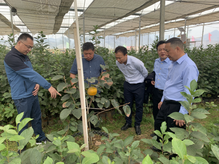 ▲桂林市市场监管局副局长梁文强(左一)带队调研柿产业标准体系构建(王敏丹摄)