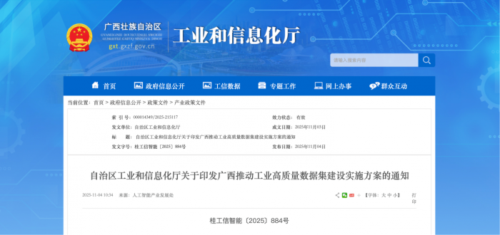 11月4日,广西工信厅正式印发《广西推动工业高质量数据集建设实施方案》。来源:广西壮族自治区工业和信息化厅官网截图