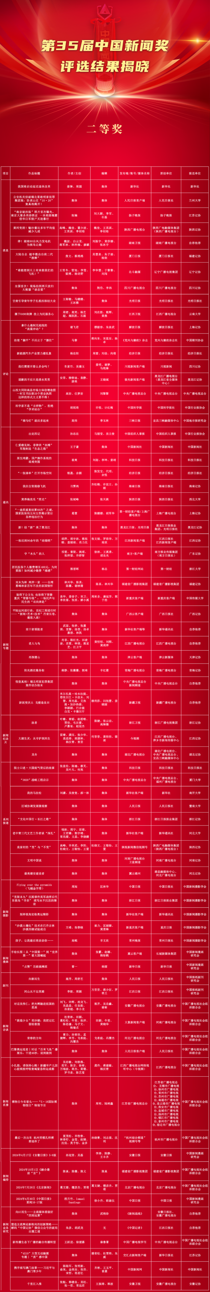 由中华全国新闻工作者协会主办的第35届中国新闻奖评选结果于11月5日揭晓。来自各级各类媒体的377件作品获中国新闻奖,其中,特别奖4件、一等奖74件、二等奖113件、三等奖186件。