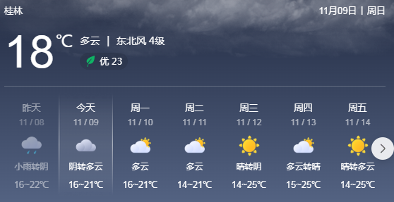 预计,今天晚上到明天白天全区大部地区阴天到多云有分散小雨百色、河池两市阴天有小雨