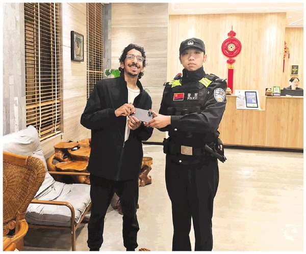 手机失而复得,来自沙特阿拉伯的游客易卜拉欣为桂林民警点赞。(秀峰公安分局供图)