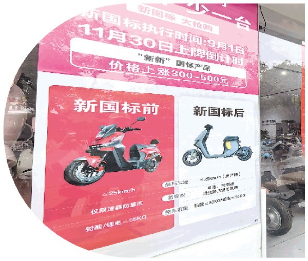 一家销售门店张贴了醒目的宣传海报,将新旧国标电动自行车进行对比。 记者张苑 摄