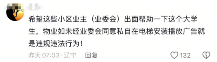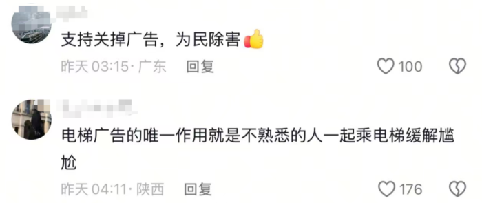 他还表示,从初中开始他就被迫接触电梯广告,虽然不少居民都对这种“入侵式”广告很不满,但始终没有人愿意真正动手关掉。