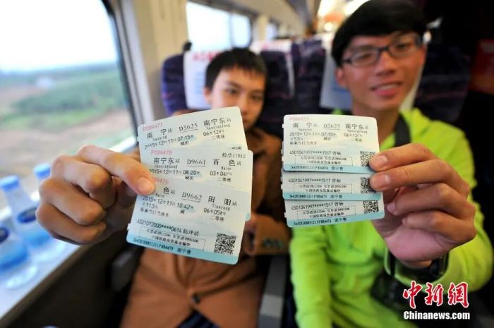 资料图:两名从南宁乘坐动车前往百色的市民展示来回往返的动车票。 胡雁 摄