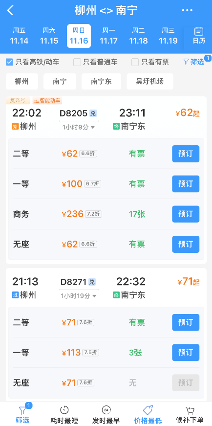在南珠高铁南玉段、柳南客专等“1小时高铁交通圈”重点线路,如南宁东至玉林北的G5501次二等座票价较原执行票价优惠19元,柳州至南宁的C8677次二等座票价较原执行票价优惠16元,进一步降低短途出行成本。