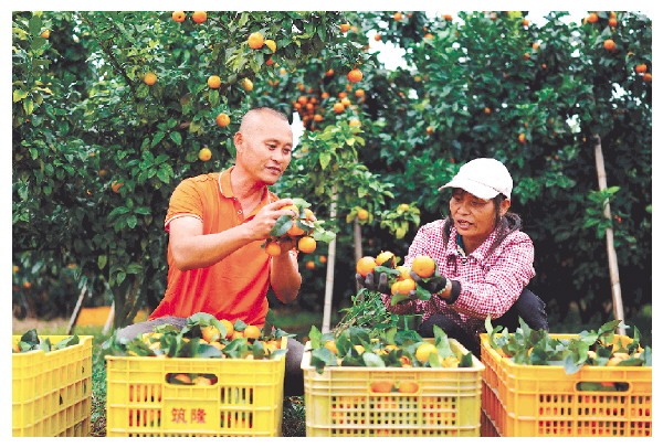 在潭下镇码头村的荣荣兴果蔬种植专业合作社基地,阳光映照下的金秋砂糖桔色泽鲜亮、圆润饱满。工人们分工协作,采摘、分拣、装筐、转运等工序有条不紊,一筐筐新鲜果实即将发往全国各地。“今年基地720亩金秋砂糖桔已被客商包园预订,统价10元每公斤,预计产量超100万公斤,销售额将突破1000万元!”合作社负责人阳细荣满脸喜悦地说道,“现在我们每天按订单采摘,完全不用担心销路问题。”