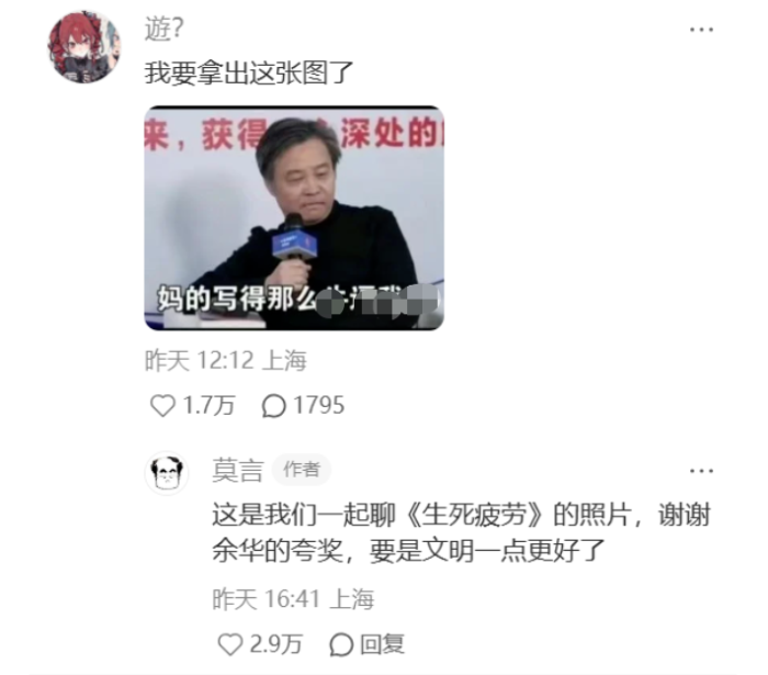 在评论区,网友和莫言各种玩梗,欢乐不断。莫言回复网友评论的余华表情包,称:“谢谢余华的夸奖,要是文明一点更好了。”