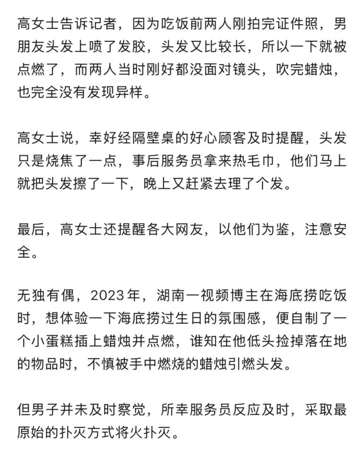 11月15日,记者致电当事人高女士得知,11月14日,她与男朋友在海底捞过纪念日,本想拍视频记录甜蜜时刻,没想到男朋友扭头亲了一下她,几秒钟功夫,男友的头发就被蜡烛点着了。