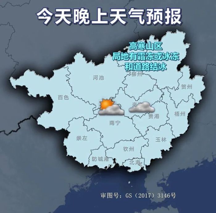 今天(19日)晚上,全区多云间阴,高寒山区局地有霜冻或冰冻和道路结冰。最低气温:高寒山区-4~4℃,桂北5~9℃,桂南8~11℃。