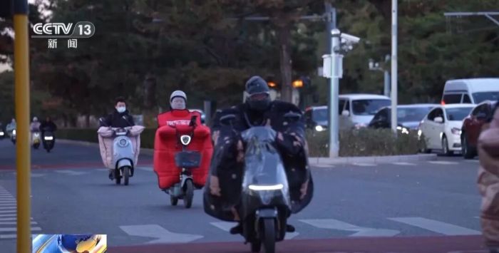 在陕西渭南临渭区,记者看到,电动车骑手们纷纷“全副武装”,从车把固定手套到一体式挡风被,各类防寒装备五花八门。一位女士的一条长长的围巾随风飘扬,虽添了几分飘逸,但也带来了风险。而另一位男士为抵御寒风,将外套反穿在胳膊上。