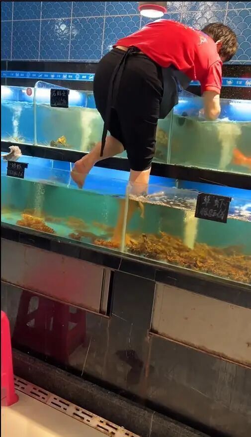 视频显示,女子赤脚踩的那个海鲜池上,贴有一个写着“对虾”字样的标牌。
