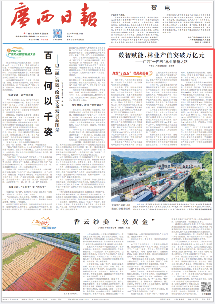 从采伐到加工,从生产到流通,广西林业数智转型成效显著:AI`视觉质检让不良品率下降40%,智能供应链协同使采购及时率提升60%,连续平压技术填补国内产业空白,“人工智能+林业”的创新产品与典型案例不断涌现。2025年上半年,全区林草产业总产值达5495亿元,同比增长24.3%;按国民经济统计口径,林业产值增速达8.3%,超额完成自治区下达的4.5%稳增长任务,已连续10个季度领跑农林牧渔业。