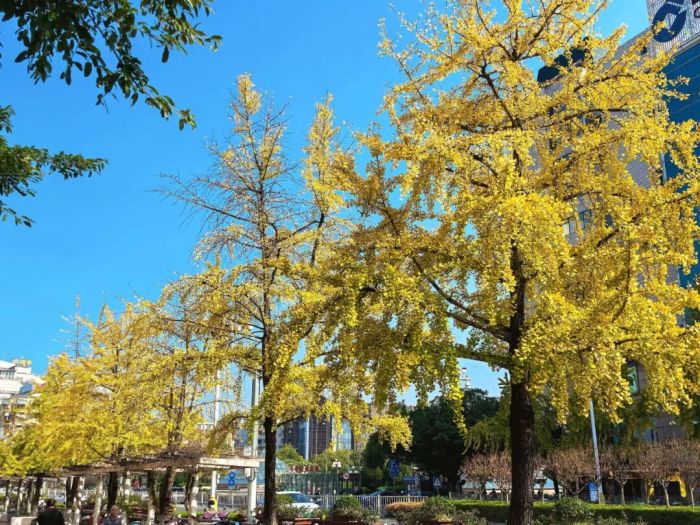 11月24日,桂林市区阳桥附近的不少银杏叶已经变黄。