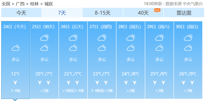 相关数据显示,11月23日上午8时至24日上午8时,广西大部地区以晴到多云的天气为主。最高气温全区大部为22~26℃,南宁城区及崇左龙州县气温最高,达到26.6℃。最低气温全区大部基本都是“1”字头,桂北部分地区只有个位数,桂林资源县气温最低,仅6.3℃。