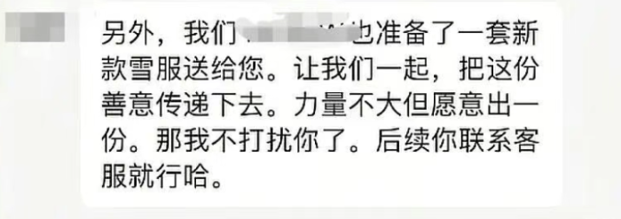 11月23日,滑雪服品牌负责人孟女士表示,该品牌创立四年来,已更换三批不同的公益寻亲吊牌,邓女士购买的衣服系第二批吊牌,目前已赠送她一套全新的滑雪服和帽子作为答谢。