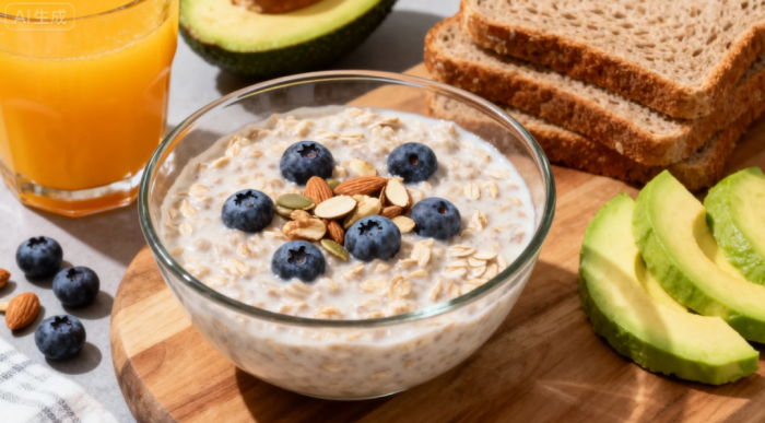 主食可尝试全麦面包、纯燕麦片,少吃起酥面包、水果麦片、薯条、炸薯饼等,蛋白质可选择煎三文鱼、鸡胸肉、牛排等,外加一杯牛奶或酸奶。