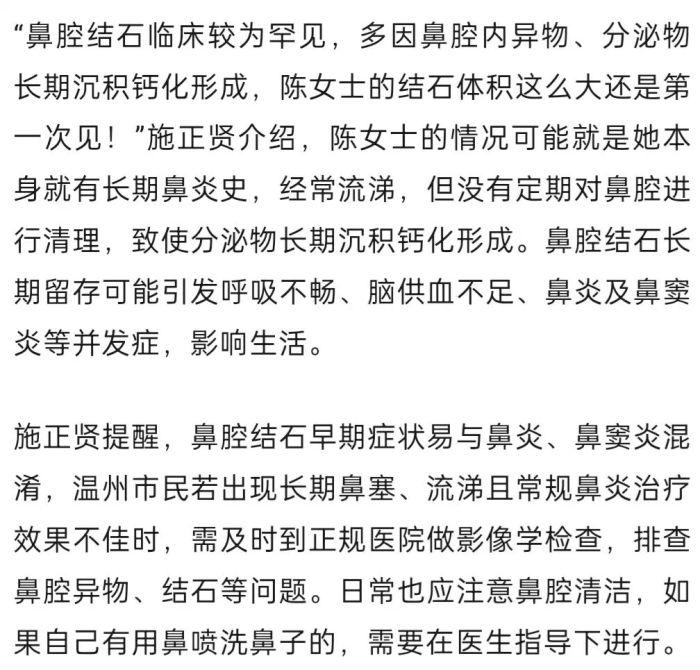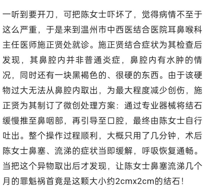一连鼻塞几个月,以为是鼻炎,然而吃药却总不见好,到医院检查却发现罪魁祸首竟是一颗2厘米大的结石!