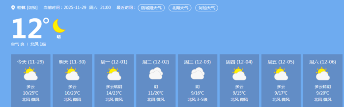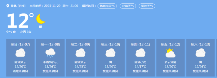 降水量方面:预计12月广西各地降水量:桂林市大部,贺州市北部为40~60毫米;其余地区为20~40毫米;全区平均为40.2毫米,是一年中降水最少的月份。与常年同期相比,桂东北偏少2~4成,其余大部地区偏少1~2成。