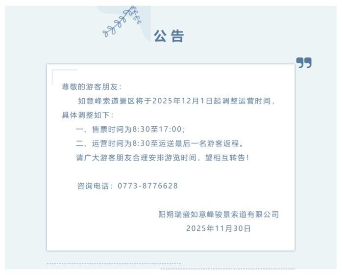 11月30日,桂林阳朔如意峰索道景区发布运营时间调整公告: