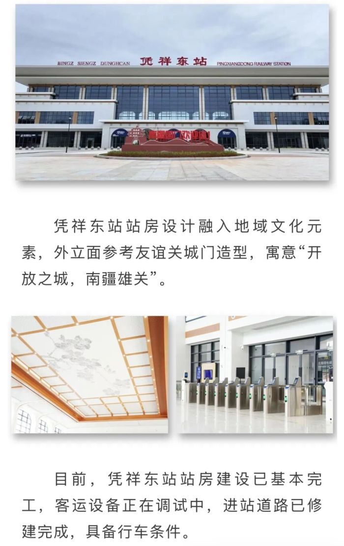南凭高铁连接广西壮族自治区首府南宁市与中越边境口岸城市凭祥市,分南宁至崇左、崇左至凭祥两段建设,其中南宁至崇左段已于2022年12月开通运营。本次开通运营的南凭高铁崇凭段起自崇左南站,经崇左市,终至凭祥市凭祥东站,线路全长81公里,设计时速250公里。全线共设崇左南、宁明东、龙州、凭祥东站,其中崇左南站为既有车站,其他为新建车站。