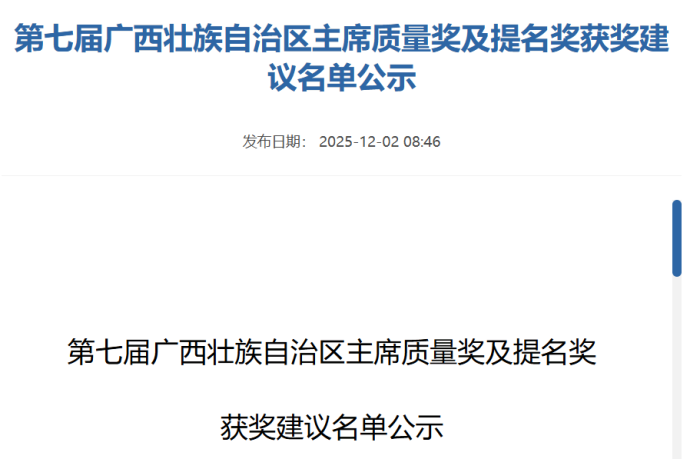 12月2日,第七届广西壮族自治区主席质量奖及提名奖获奖建议名单公示。