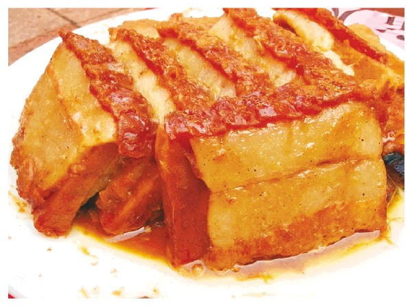 “精”在选料,是同安扣肉的品质根基。制作时只取猪腹部的带皮五花肉,必须掐头去尾,剔除不规则边角,确保每块肉肥瘦相间、方正规整。“细”在做工,彰显传统工匠的细心。五花肉需手工切成1厘米至1.5厘米厚的双飞片,中间夹入炸制过的平乐青龙香芋片,再以慢火细蒸。“浓”在香气,巧妙交融多种风味。桂林三花酒的醇厚、本地腐乳的鲜香、胡椒粉的辛香与香芋的甘甜,在慢蒸过程中相互浸润,孕育出层次丰富、令人闻之欲醉的独特芬芳。