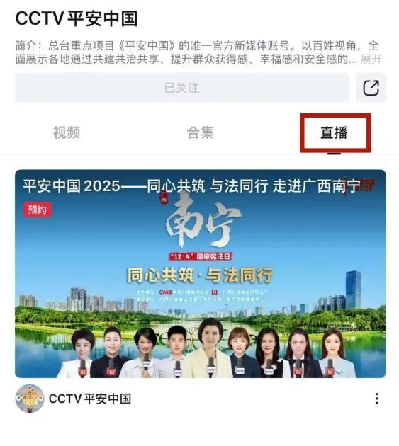 4、关注后,进入“CCTV平安中国”账号,点击直播,找到《平安中国2025——同心共筑 与法同行 走进广西南宁》专场直播。进入直播后,点击关注、预约、小红心、留言。