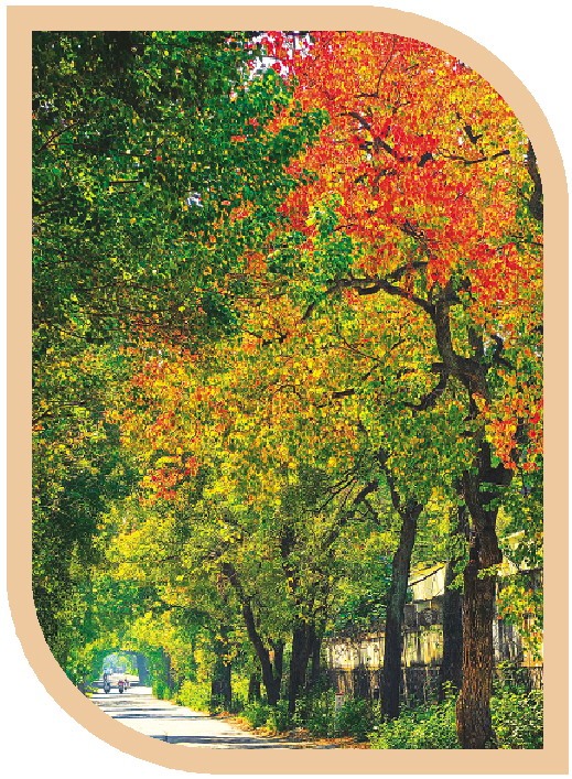 巾山路上,翠绿、绯红、橙黄的乌桕叶片在阳光下熠熠生辉。 记者周子琪 摄