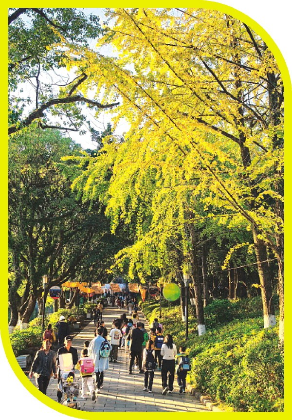 公园景区是赏叶的经典之选,山水与银杏相映成趣,别有一番韵味。近日,记者走进南溪山公园看到,成片的银杏树与公园内的山水、亭台楼阁相互映衬,尽显古典韵味。这些银杏是2008年市民捐种的,如今已长成参天大树,金黄叶片随风飘落,宛如童话世界。“我们一家人每年都有‘扫黄’的传统,在南溪山公园,一路走一路看,金黄的银杏叶让人心情都变得明朗起来。”市民王先生带着妻儿在公园游玩,孩子在银杏叶堆里嬉戏打闹,欢声笑语不断。