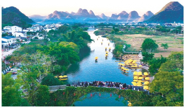 初冬时节,游客搭乘竹筏在阳朔白沙镇遇龙河段漂流,感受桂林山水的魅力。