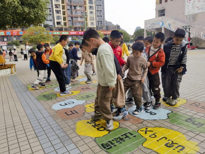 跳房子格子里印着拼音字母,墙面变身心理互动区,临桂区冠信远辰实验小学的孩子们的课间十分钟变得从未有过的有趣。