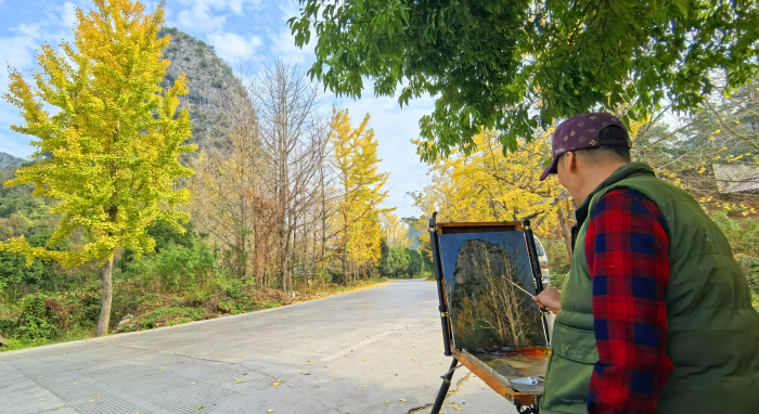 图为一位来自广东的画家在海洋乡写生,将美丽的银杏之乡绘入画卷。