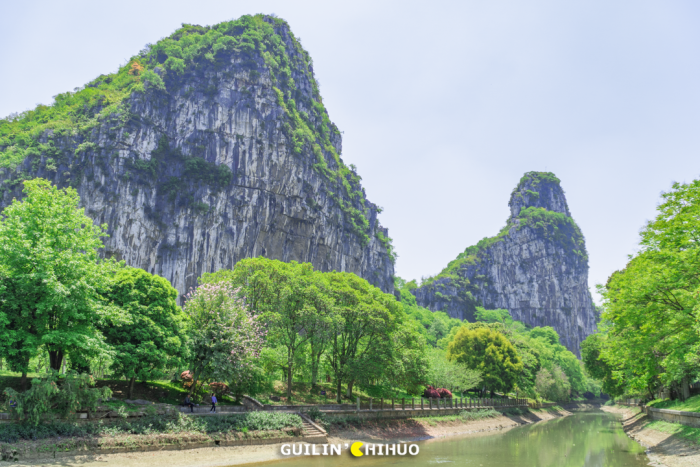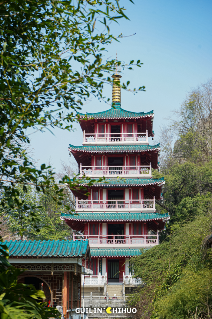 【伏波山】其孤峰雄峙漓江西岸,公园内建有癸水亭、听涛阁、还珠洞、米芾自画像、试剑石、千佛岩等名胜,徐霞客曾细致考察其岩洞水系。
