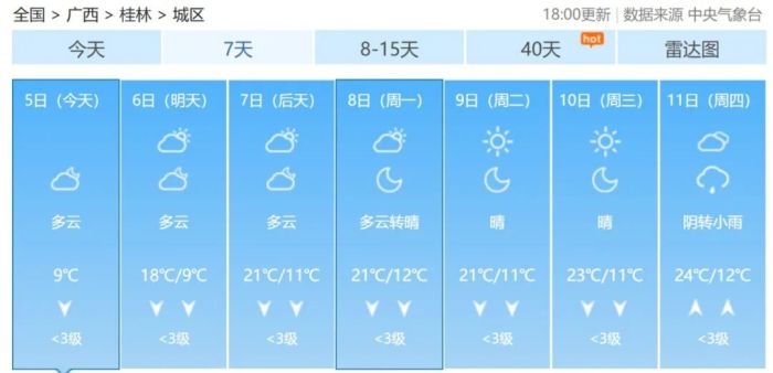 桂林也有幸加入了本次“升温阵营”。根据中央气象台发布的最新数据,桂林主城区明天(12月6日)的最高气温就会升至18℃左右,而从12月7日的最高气温就会超过20℃。大概到下周四(12月11日)之前,桂林都会保持这样的升温态势,市区最高气温或达24℃上下。