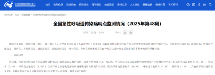 中国疾控中心12月4日发布全国急性呼吸道传染病哨点监测情况(2025年第48周)。