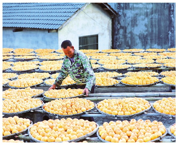 嘉会镇泗安村村民在家中院子晒柿饼。