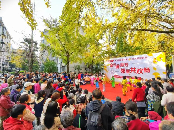 12月6日,桂林市七星区东江街道猫儿山社区联合桂林银行高新支行,共同在金黄银杏环绕的社区主干道举办第九届银杏文化节,吸引了社区居民、共建单位代表、市民等上百人参与,大家一起在银杏树下看节目、吃美食,共享美丽的“金黄时光”。