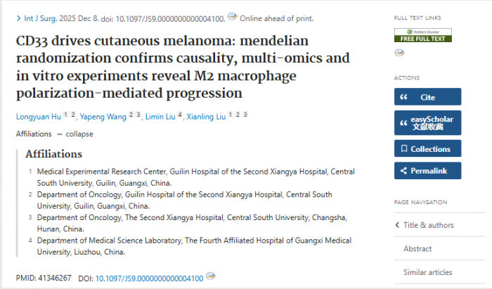 近日,湘雅二医院桂林医院刘先领教授团队在国际知名期刊《International Journal of Surgery》(国际外科学杂志),(JCR 1区,影响因子10.1)上发表了题为《CD33 Drives Cutaneous Melanoma: Mendelian Randomization Confirms Causality, Multi-Omics and In Vitro Experiments Reveal M2 Macrophage Polarization-Mediated Progression》的原创性研究成果。该研究首次阐明CD33通过调控巨噬细胞极化驱动皮肤型恶性黑色素瘤(Cutaneous Melanoma,CM)发生发展的核心机制,并创新性提出靶向CD33+巨噬细胞的免疫治疗新策略,为恶性黑色素瘤精准诊疗提供了全新方向。中南大学湘雅二医院桂林医院为论文的第一完成单位及通讯作者单位,医学实验研究中心(漓江学者实验室)胡龙元主管技师和肿瘤血液科王亚鹏博士并列第一作者,肿瘤血液科刘先领教授为论文的通讯作者,胡龙元主管技师为共同通讯作者。